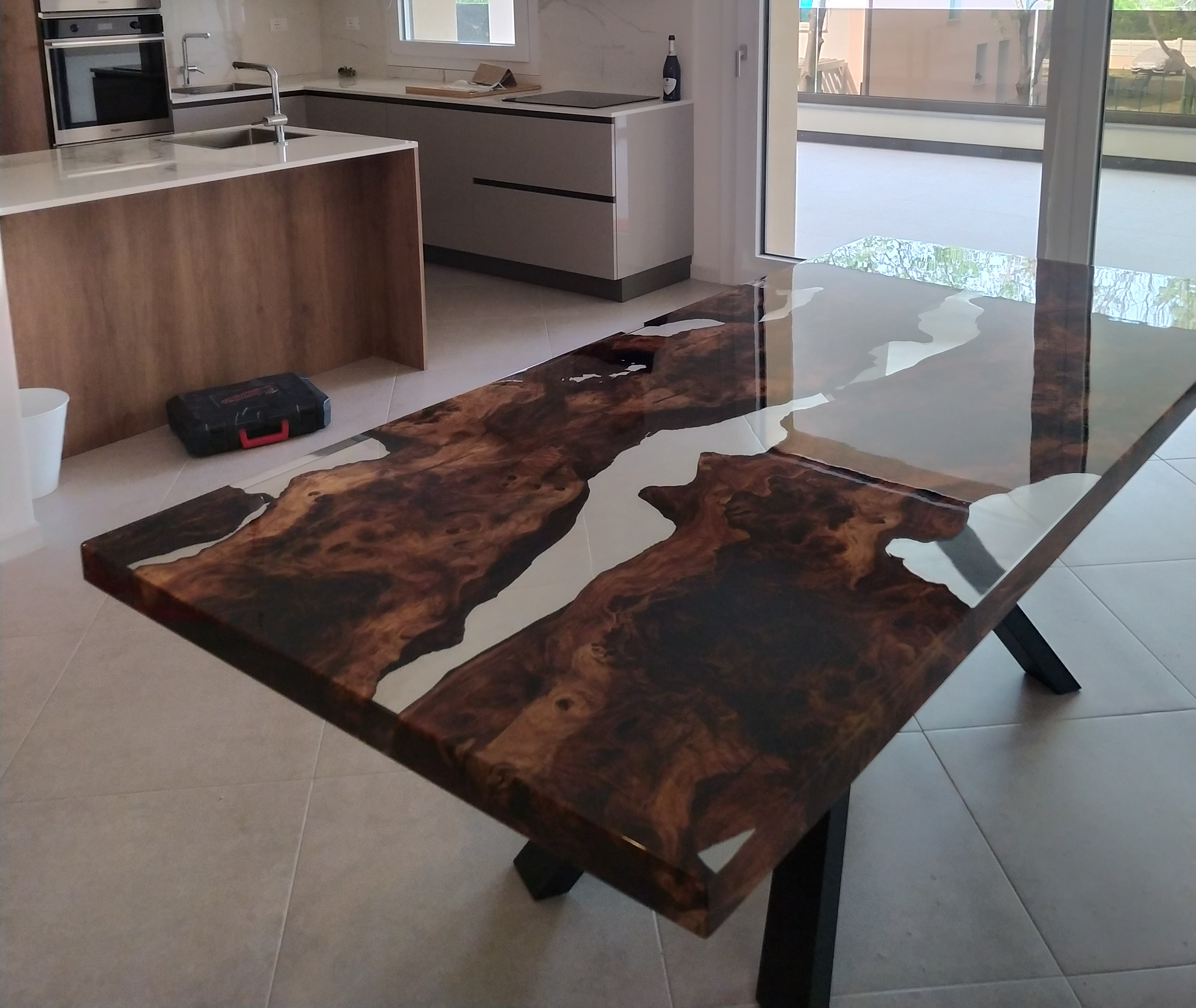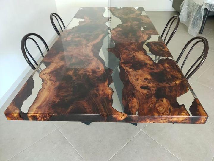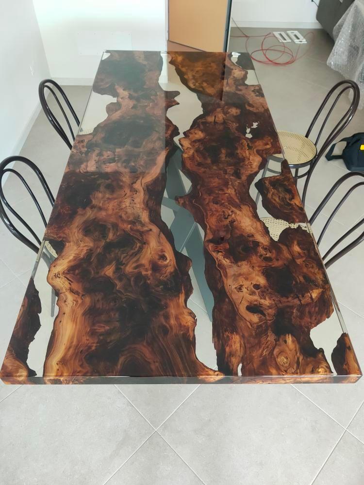 Questo tavolo è una variazione del modello "Olmo Surf", caratterizzato da una forma regolare e una trasparenza cristallina senza bolle. È realizzato con legno di olmo proveniente da un albero naturalmente essiccato e scavato da insetti xilofagi. Questa condizione unica del legno, oltre a conferire un'estetica particolare, ne richiede l'inclusione totale in resina per garantirne la stabilità.