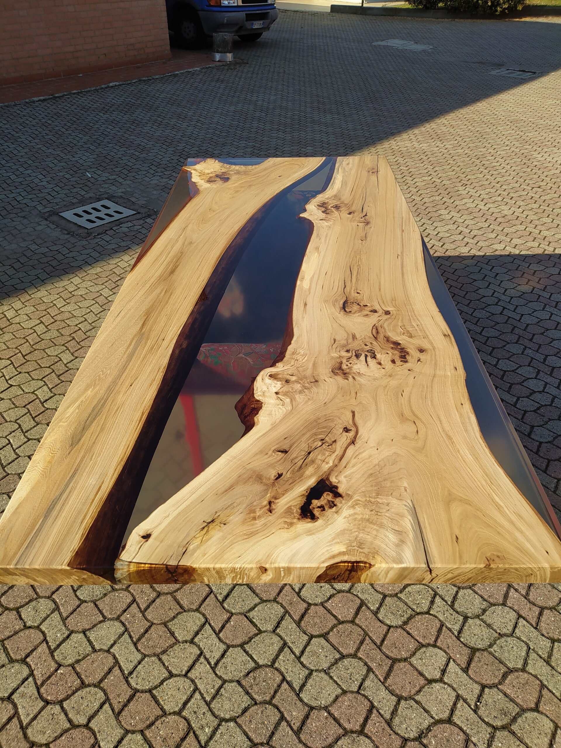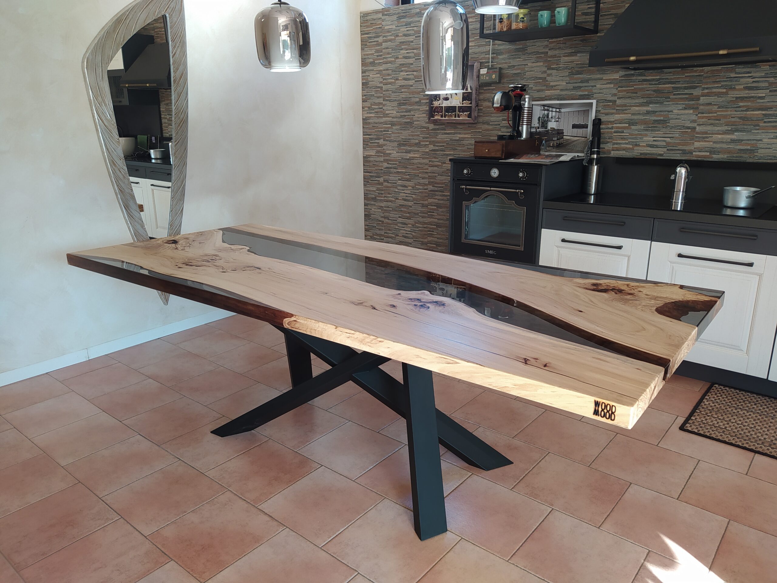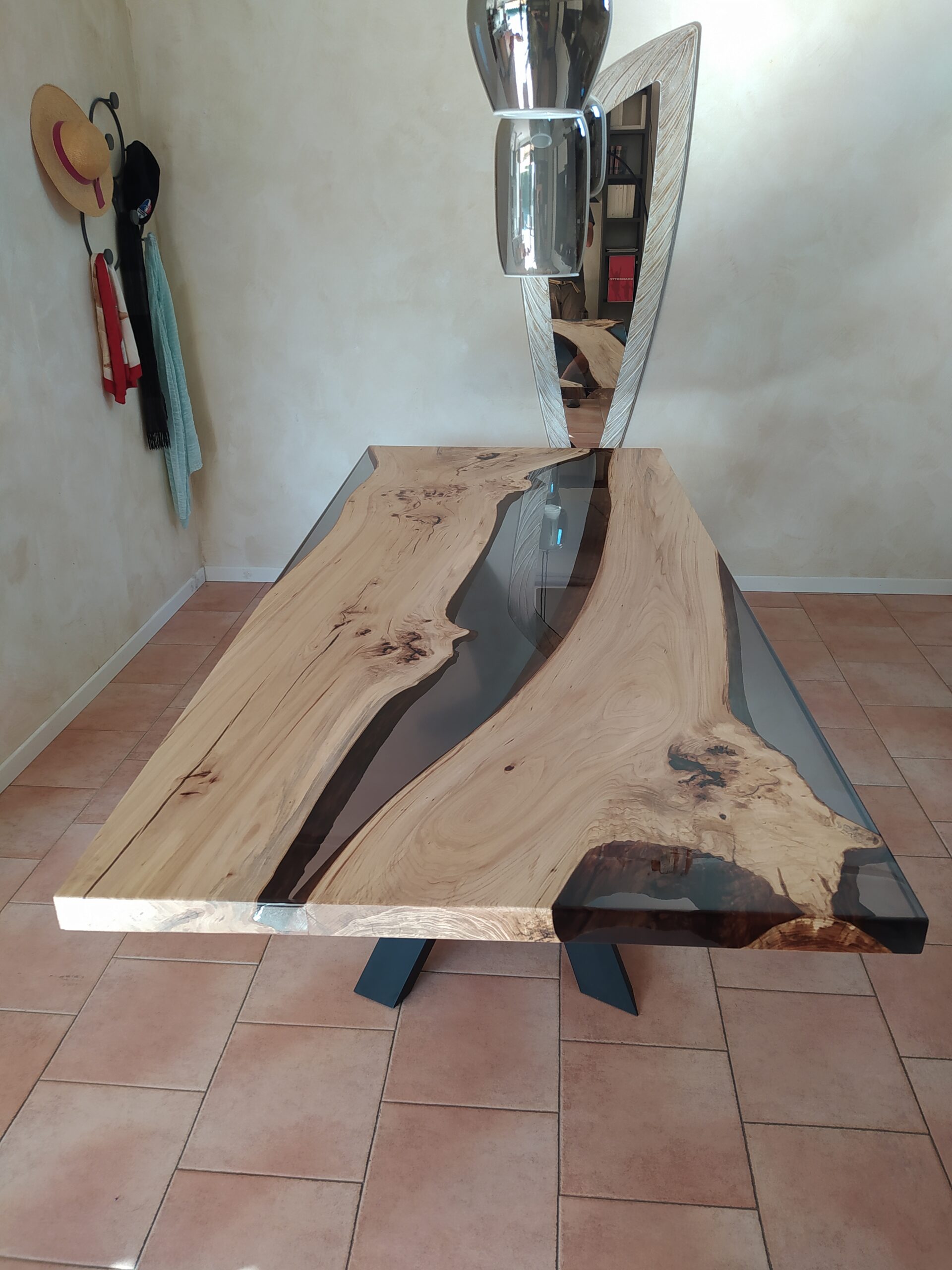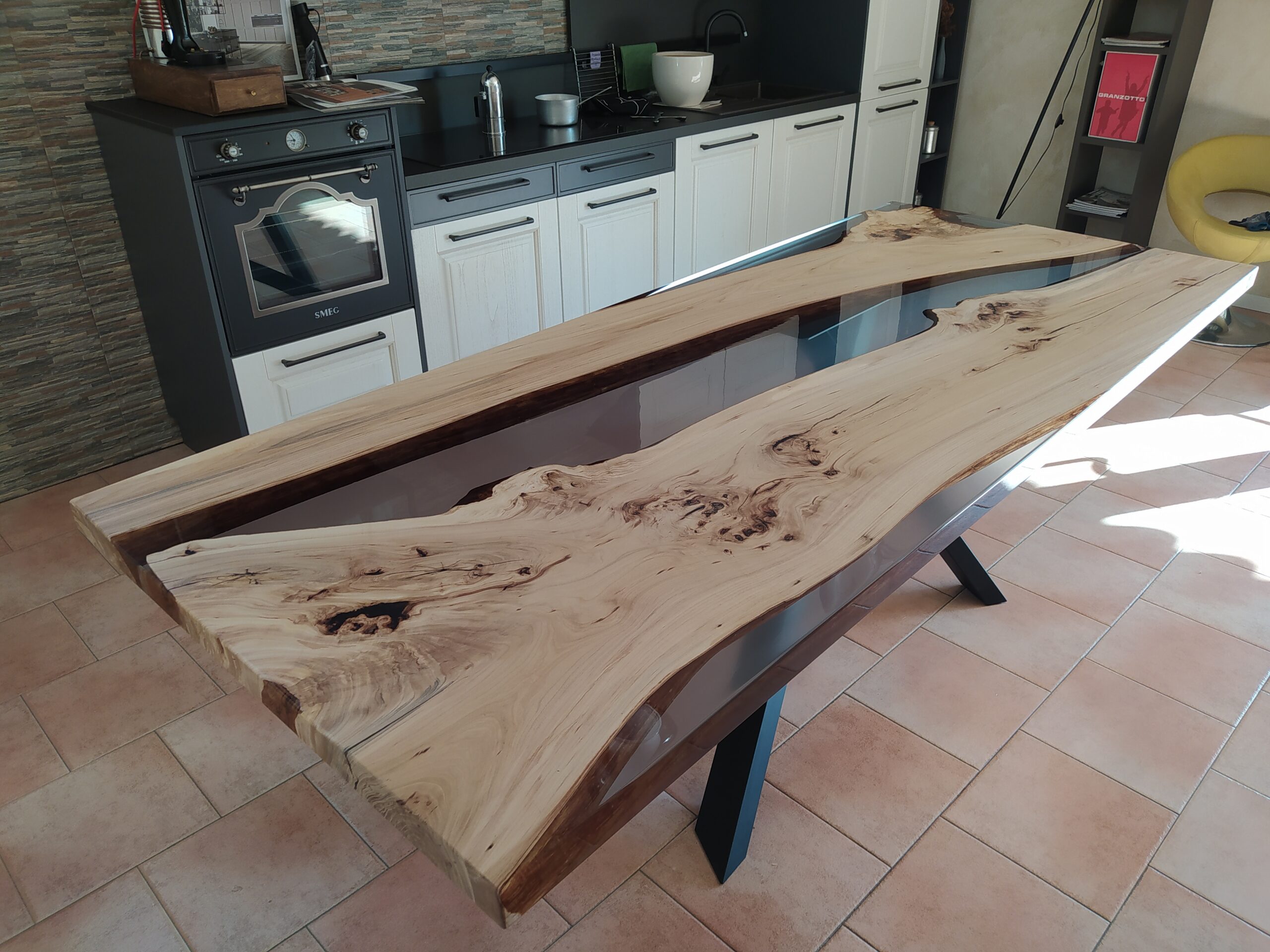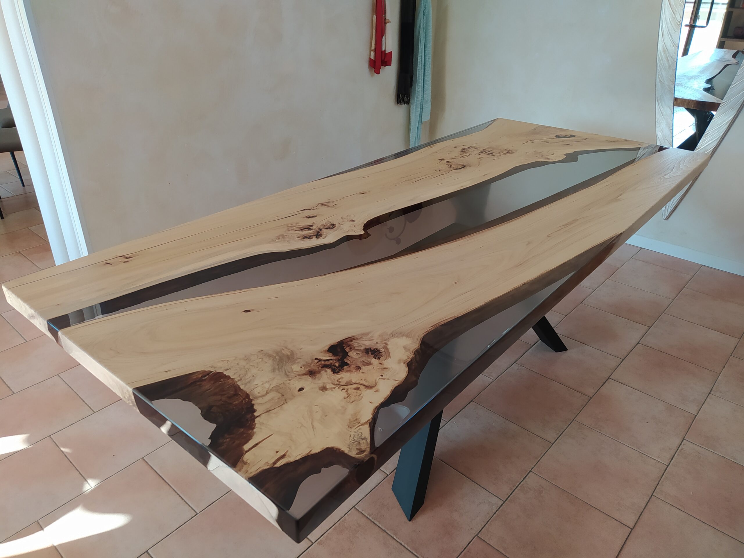 Tavolo in legno di olmo chiaro e resina trasparente grigio fumè con finitura Top, resina verniciata lucida e legno spazzolato naturale verniciato satinato. Finitura che enfatizza il contrasto tra i due materiali.