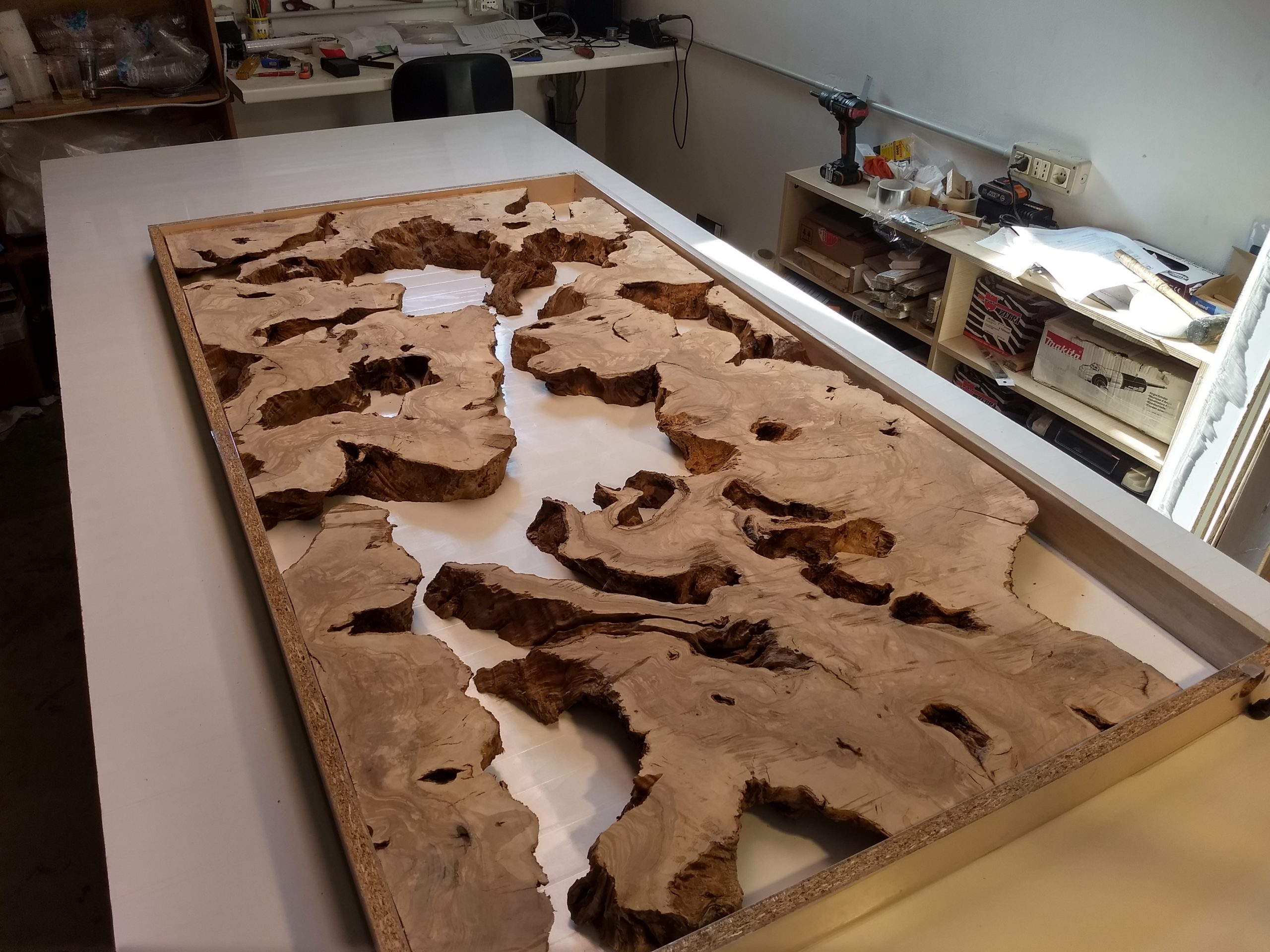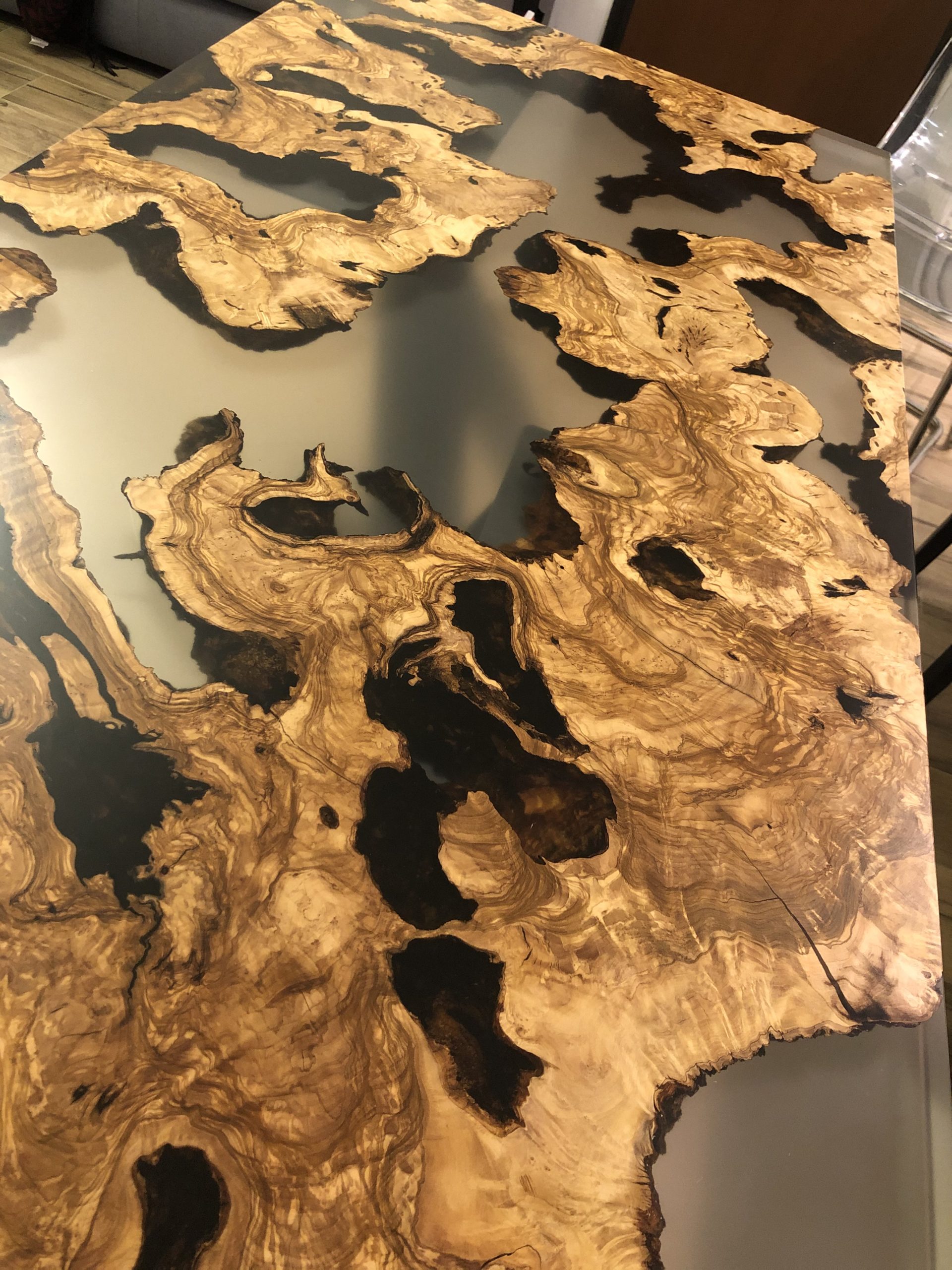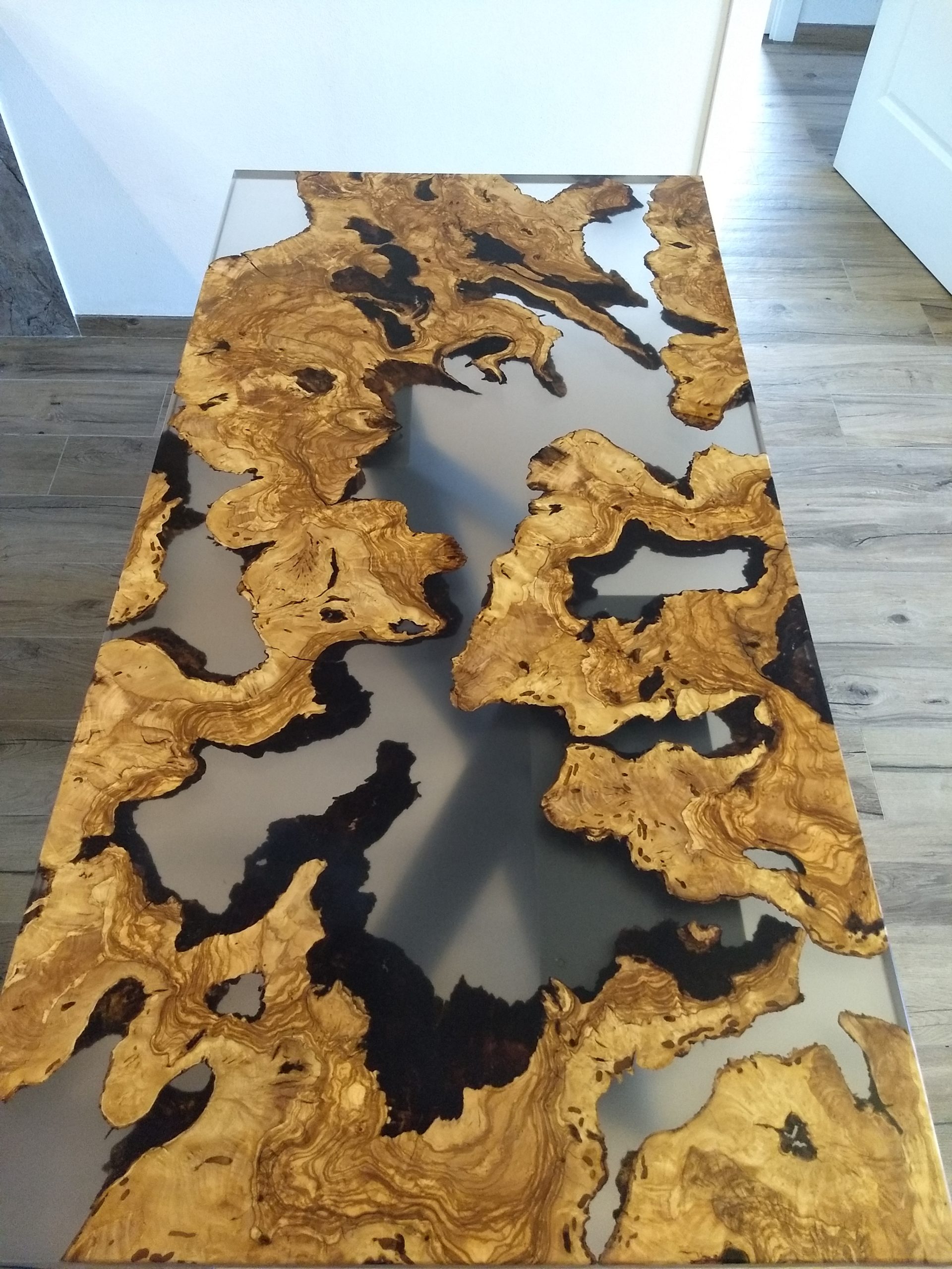 Il progetto nasce da diverse sezioni di radica di Ulivo molto antiche. Le radici vengono incastonate nella resina trasparente, andando a comporre l’arredo.