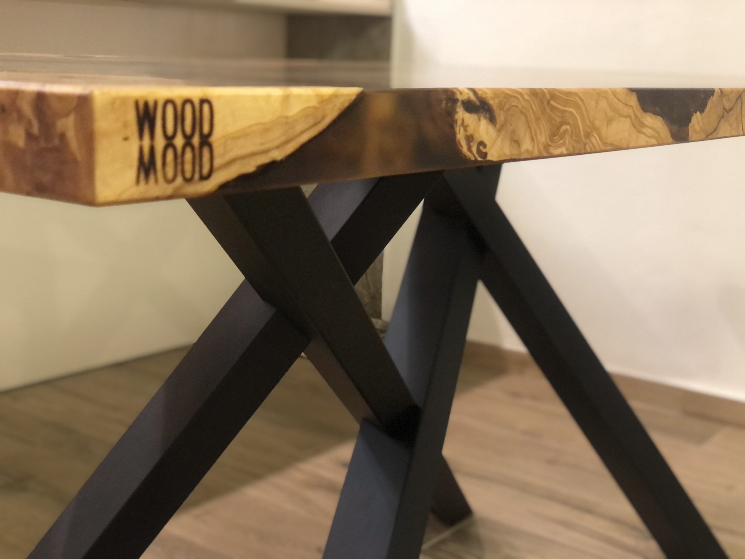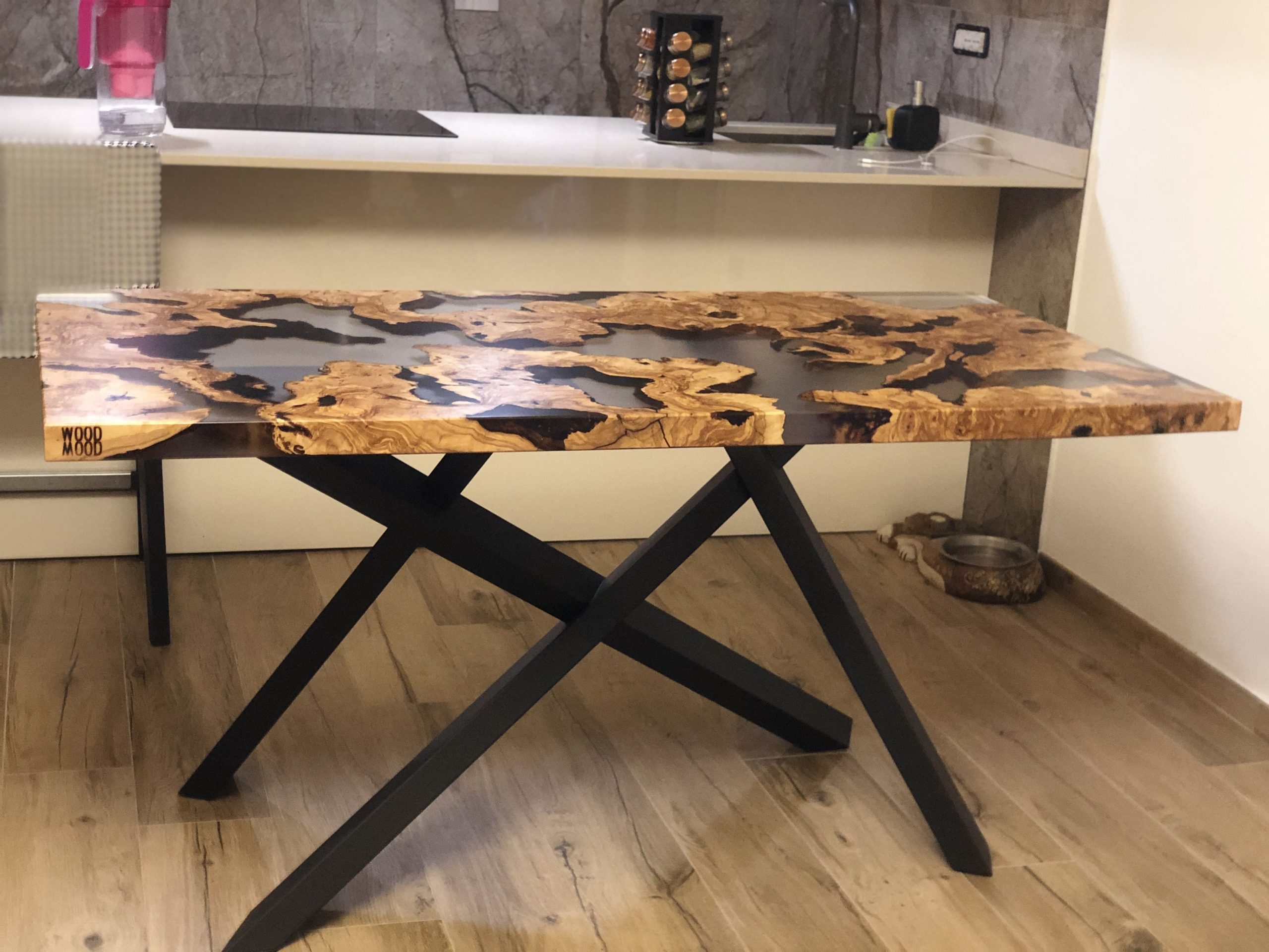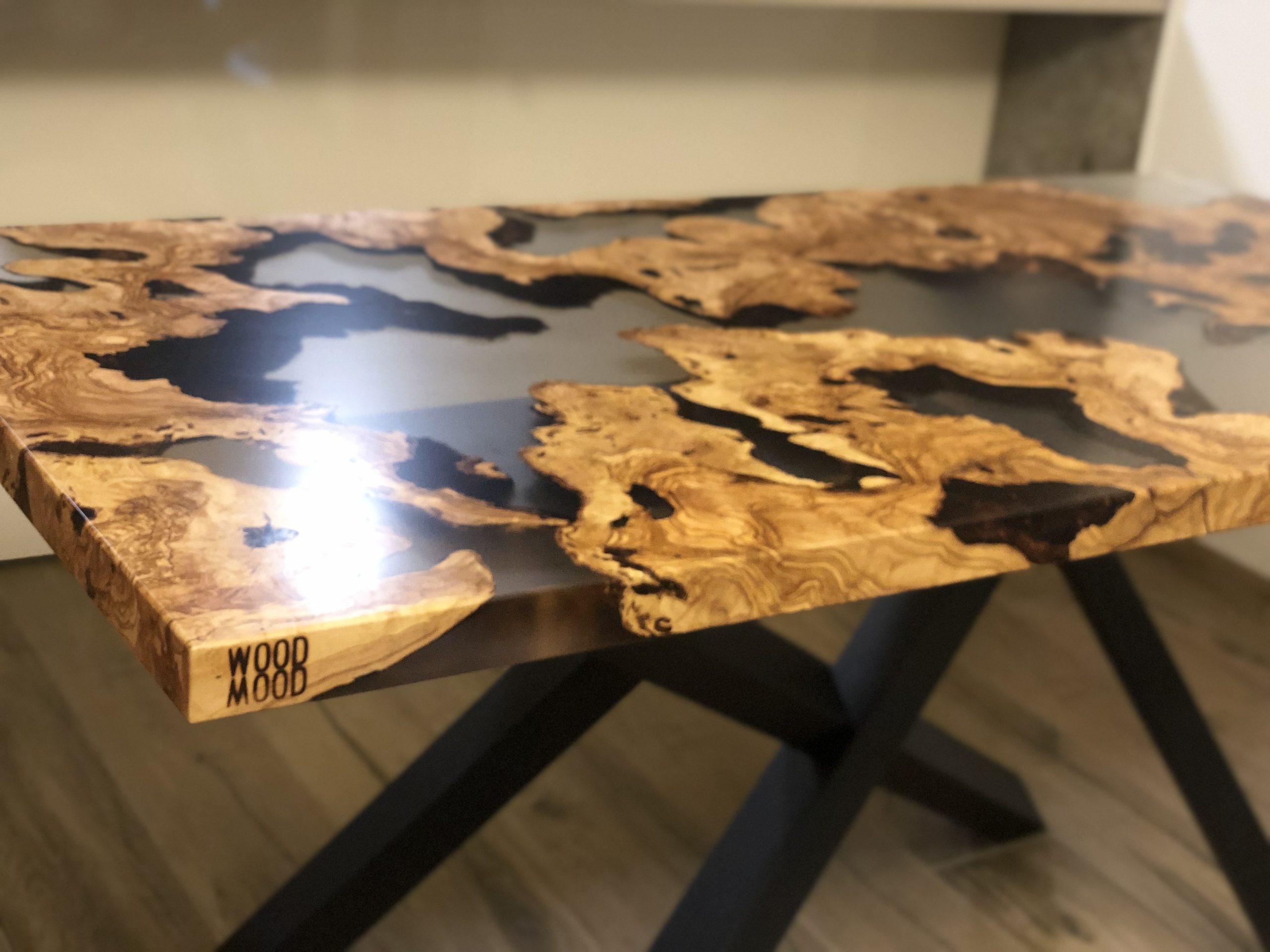 Il progetto nasce da diverse sezioni di radica di Ulivo molto antiche. Le radici vengono incastonate nella resina trasparente, andando a comporre l’arredo.